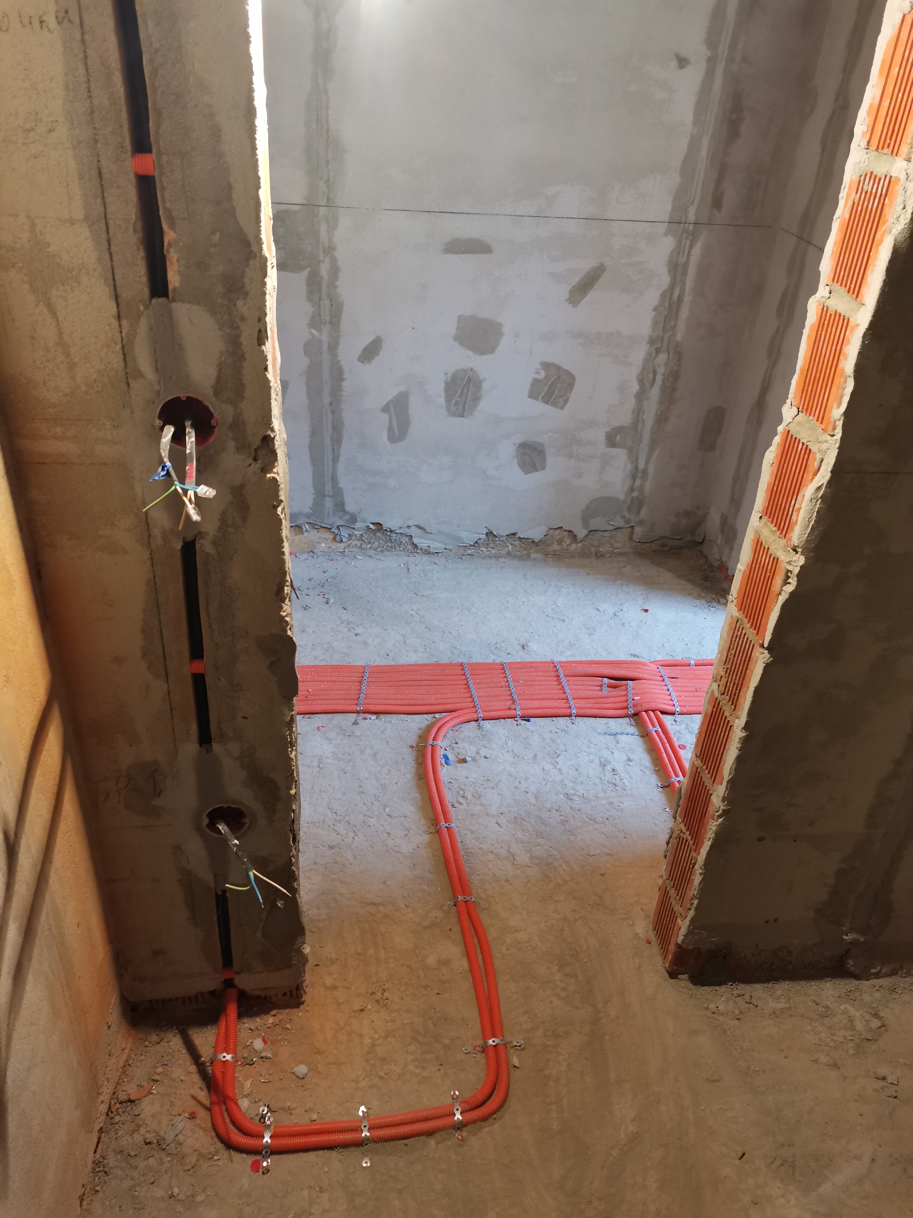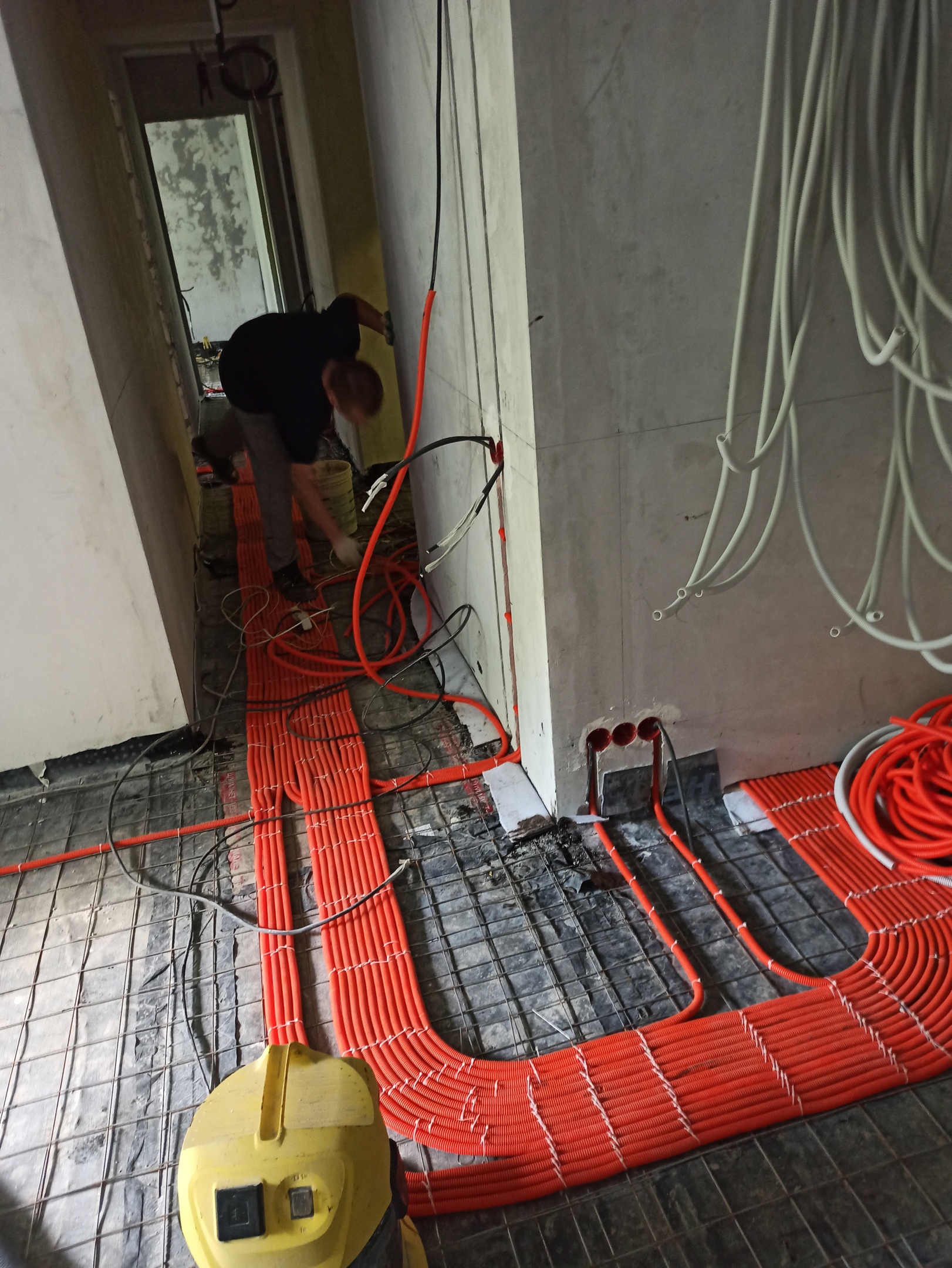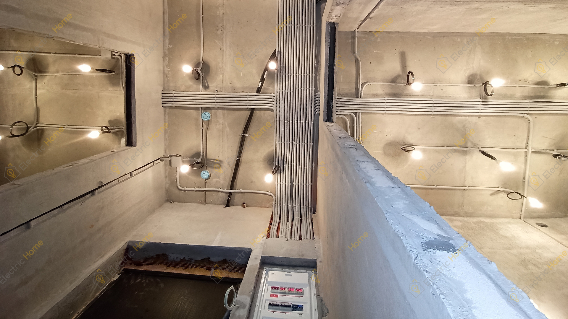 Бригада монтажников работает строго по электротехническому проекту профессиональным инструментом