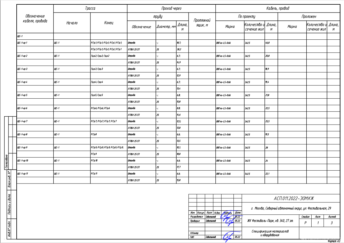 По данным распределения нагрузок делаем трассировку кабельных линий и формируем спецификацию материала